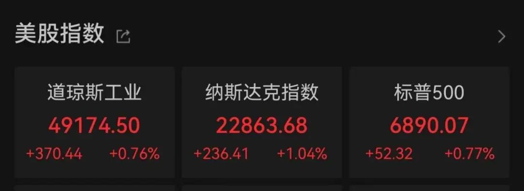 截至收盘,标普500指数涨0.77%,报6890.07点;纳斯达克综合指数涨1.04%,报22863.68点;道琼斯工业平均指数涨0.76%,报49174.5点。