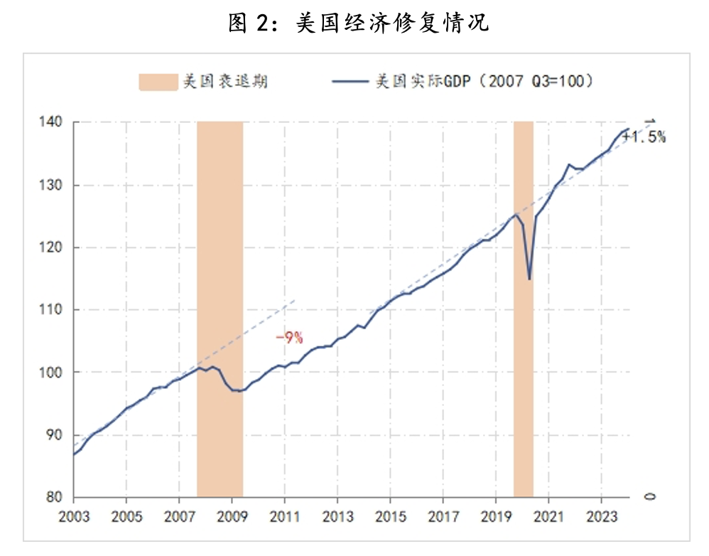 另外,从美国经济修复的趋势情况来看,在2008年金融危机后,美国经济出现了一个-9%的永久性产出缺口(以金融危机前5年为基准趋势线),但新冠疫情并没有产生类似的永久性缺口,截至今年一季度末,美国经济运行已经超出了疫情爆发前5年的趋势线1.5%,财盛证券对此美联储近期做了专题分析,结论是货币、财政、产业政策的调整,劳动力市场的弹性等因素推动了美国经济出现了明显的结构性变化,并很大程度上对冲了疫情带来的周期性冲击。