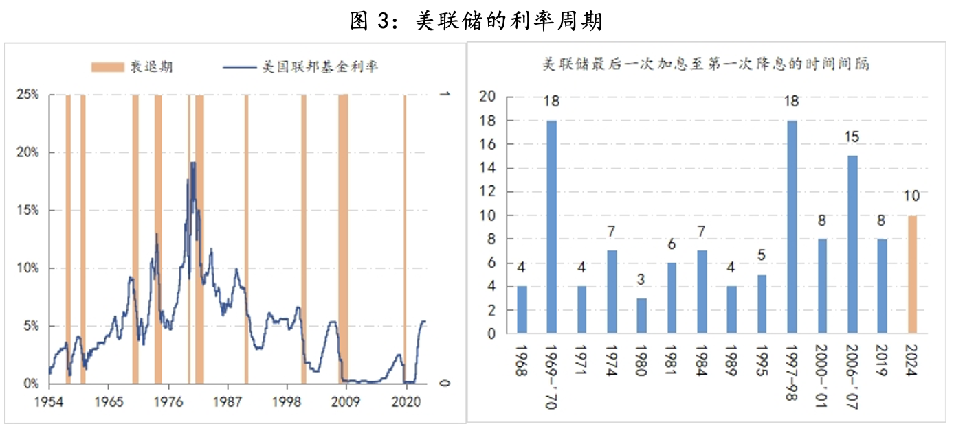 美联储利率周期的历史经验数据显示,自格林斯潘时代之后,美联储的降息周期都是在衰退来临之前开启的,即美联储对于经济衰退能够采取先发制人的利率策略,而类似“萨姆法则”的数据经验规律则是美联储先发制人的依据。截至4月,按照萨姆法则计算的失业率抬升幅度为0.37%,依然低于0.5%的衰退界定水平,同时自去年7月份结束加息周期以来,美联储已经连续10个月维持利率不变,加息与降息的时间间隔并未大幅高出8个月的历史均值,这也是我们评估美联储政策耐心的一个重要因素。