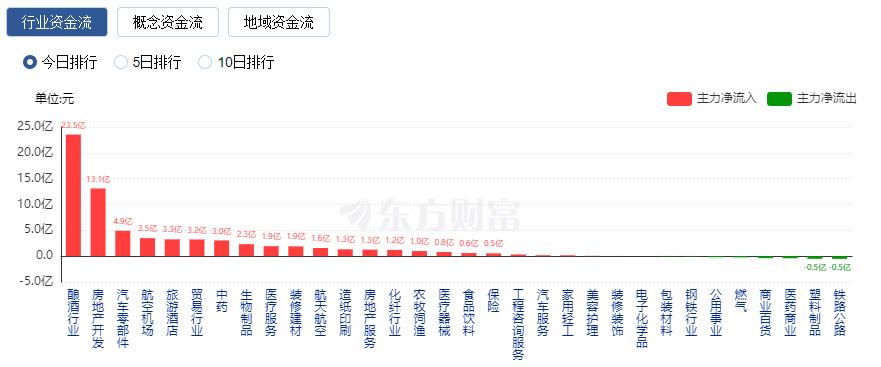 行业资金方面,截至收盘,酿酒行业、房地产开发、汽车零部件等净流入排名靠前,其中酿酒行业净流入23.54亿。